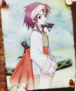 In stark contrast to the rest of Anten Seven, Hanmyo is a young girl rather than an adult. She has purple hair, pale skin, and wears a pink cloth wrapped around her forehead. She also wears a dark pink sash around her waist. She wears long, white sleeves with pink cuffs.